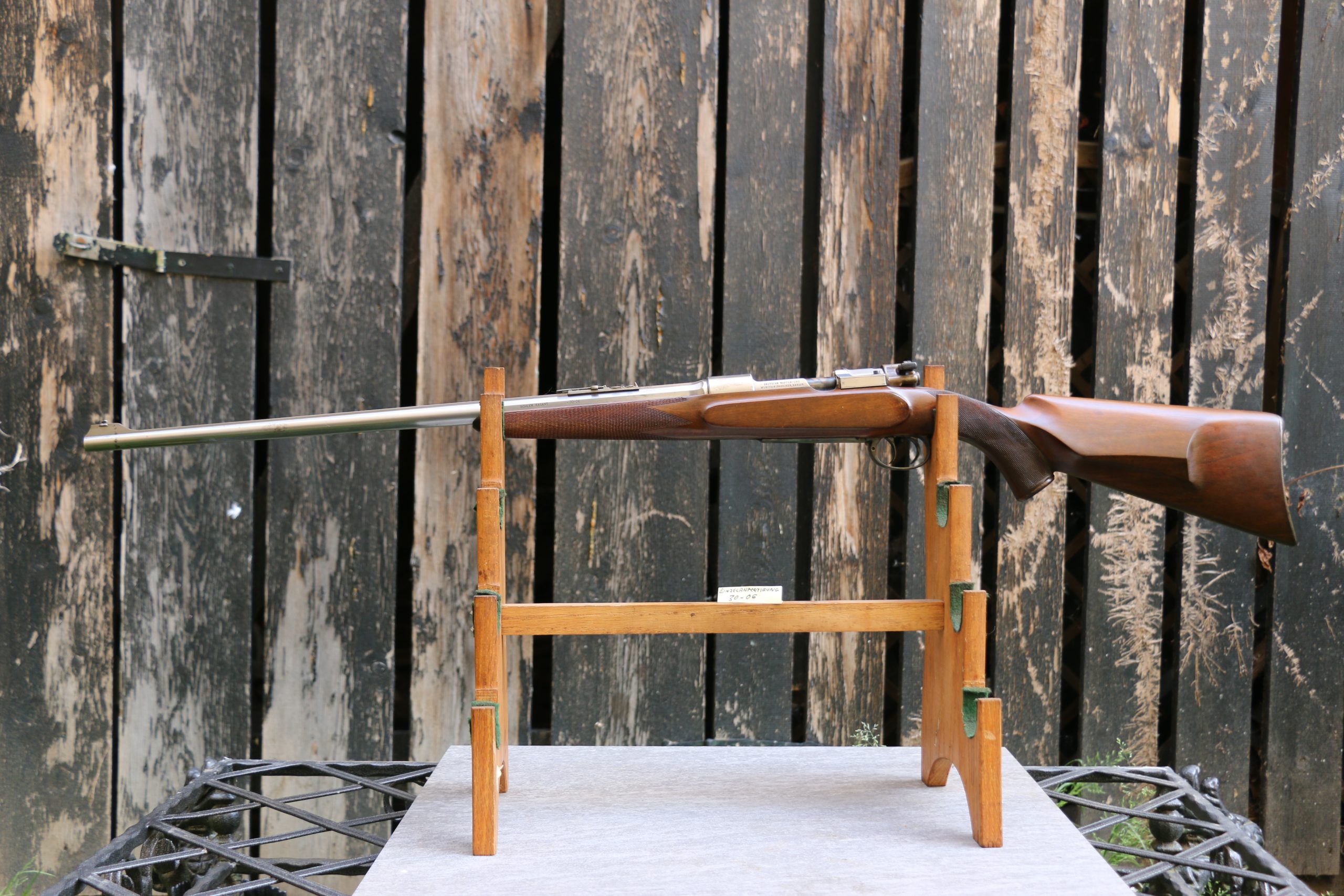 This custom Mauser 98 in .30-06, crafted by Markus Moll in Ferlach, features a distinctive half-octagon barrel, an elegant full-length scope rail, and a beautifully shaped Bavarian cheekpiece. Classic styling meets exceptional craftsmanship.